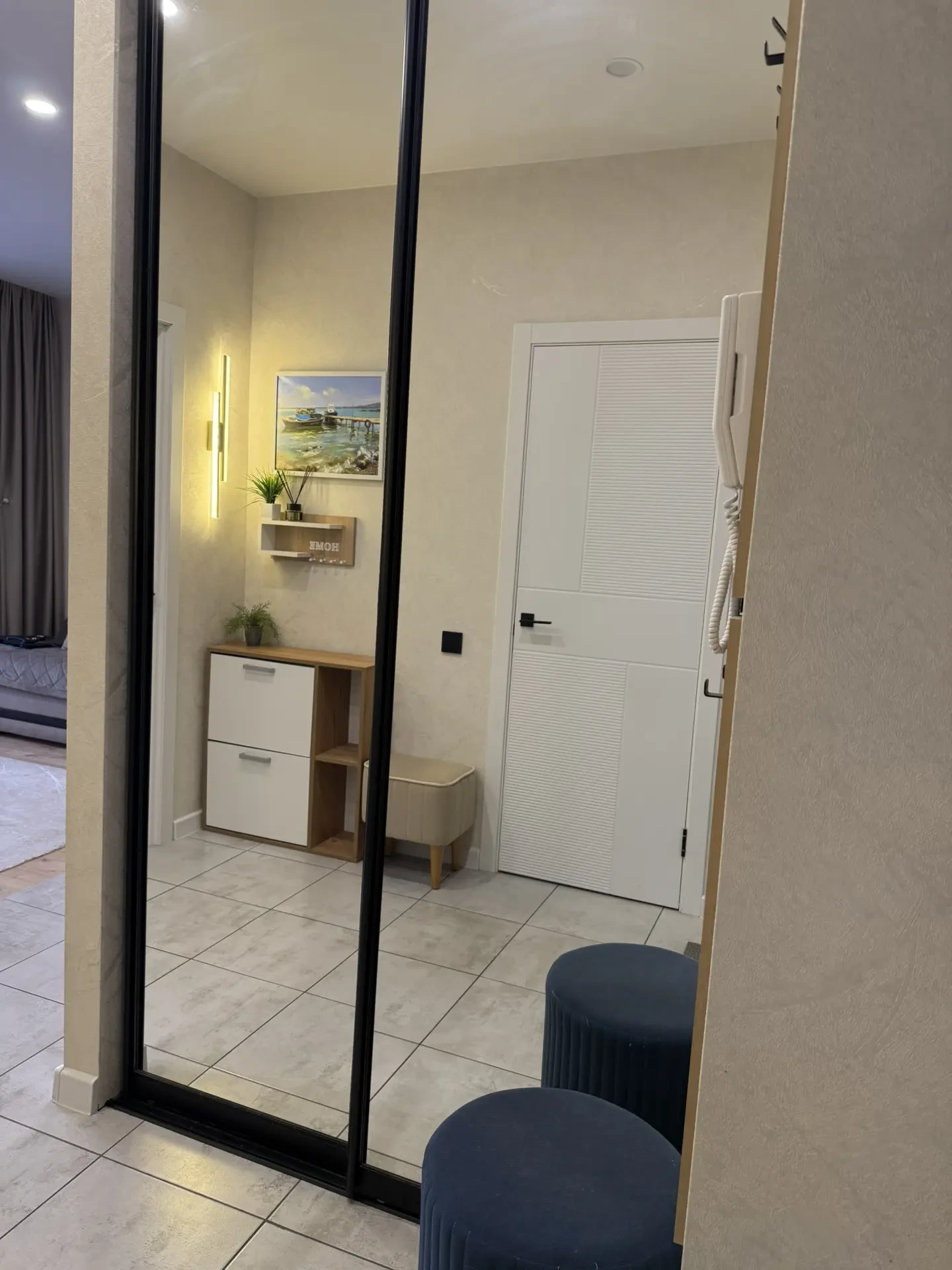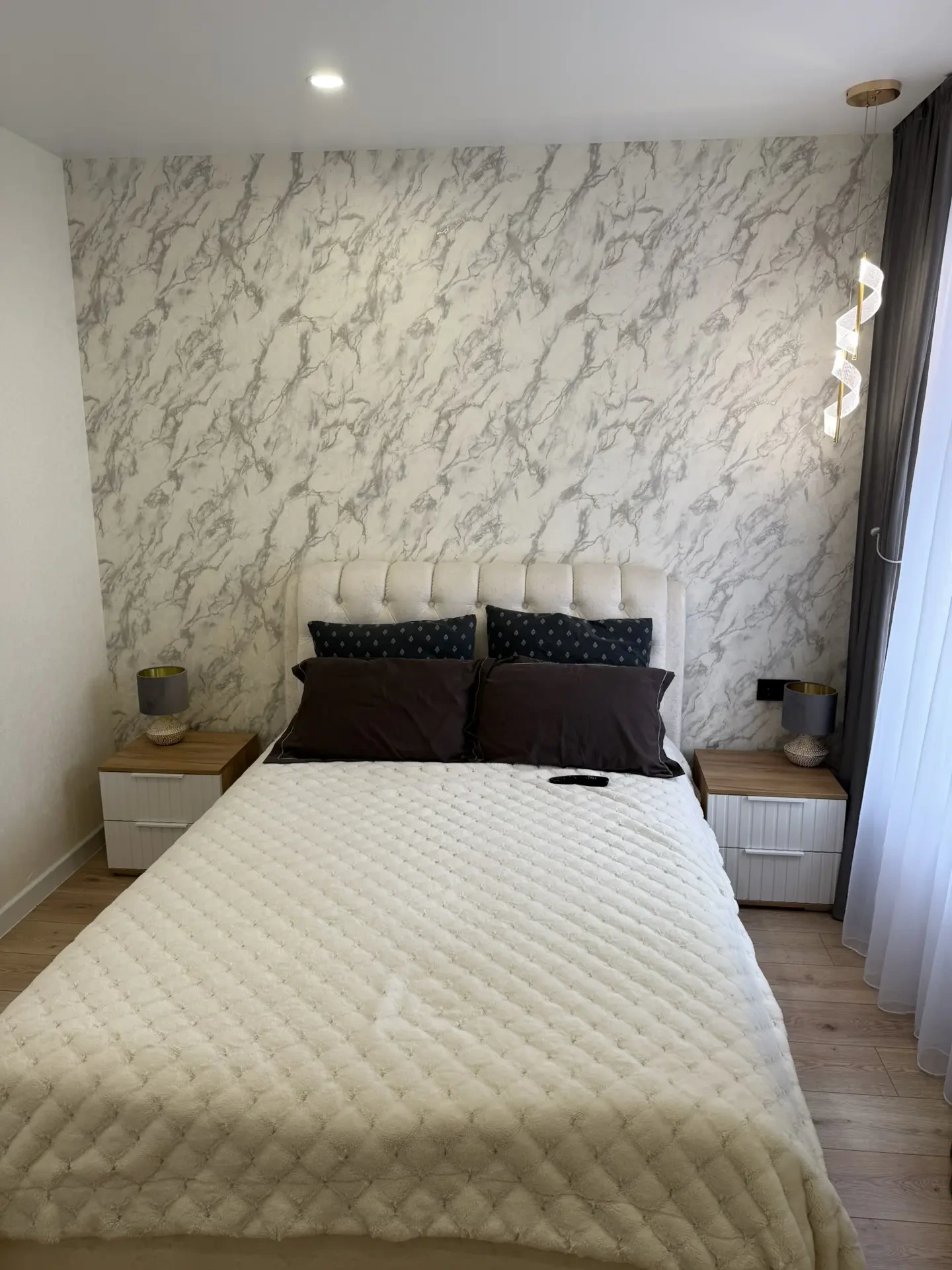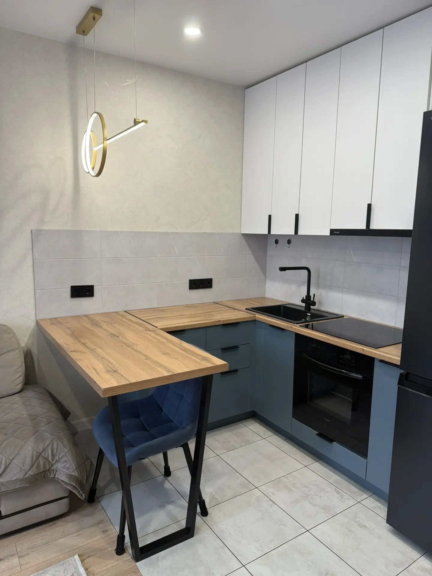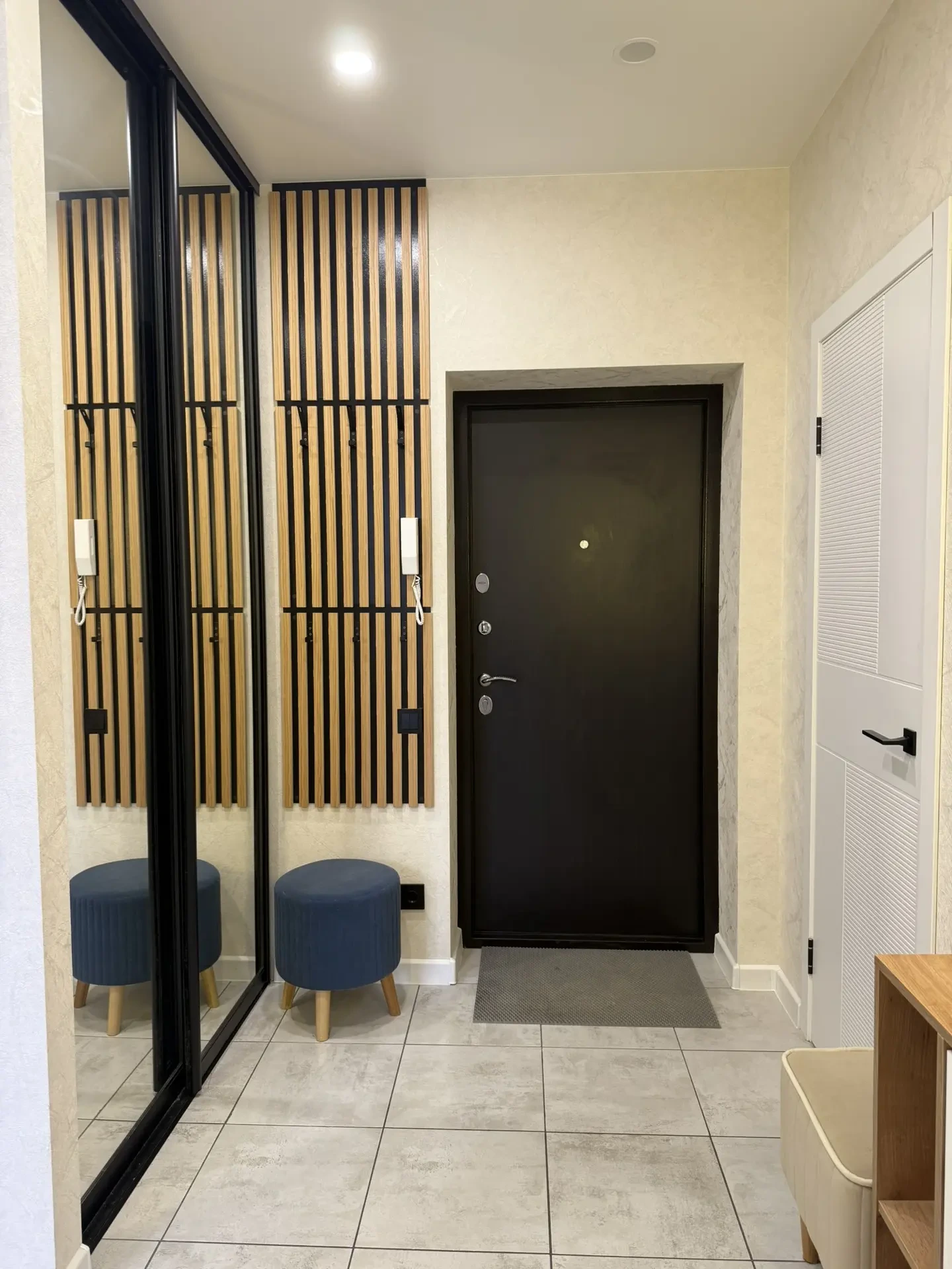 Новый дизайнерский ремонт. Санузел совместный. Напольные покрытия: в прихожей, ванной и кухонной зоне — кафель, в комнате и гостиной — ламинат. На стенах — обои. Натяжные потолки везде. Точечное освещение в кухонной зоне, спальне и перед ТВ. Мебель забираем.