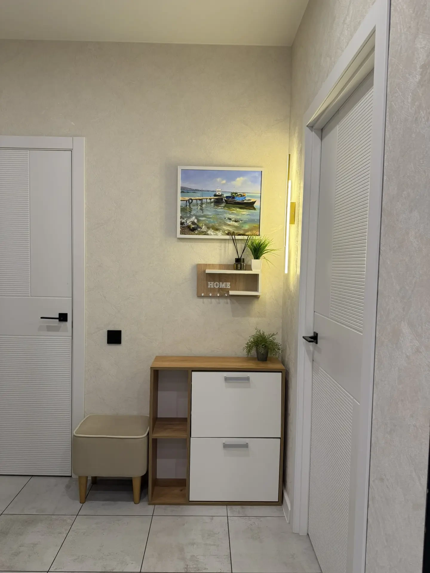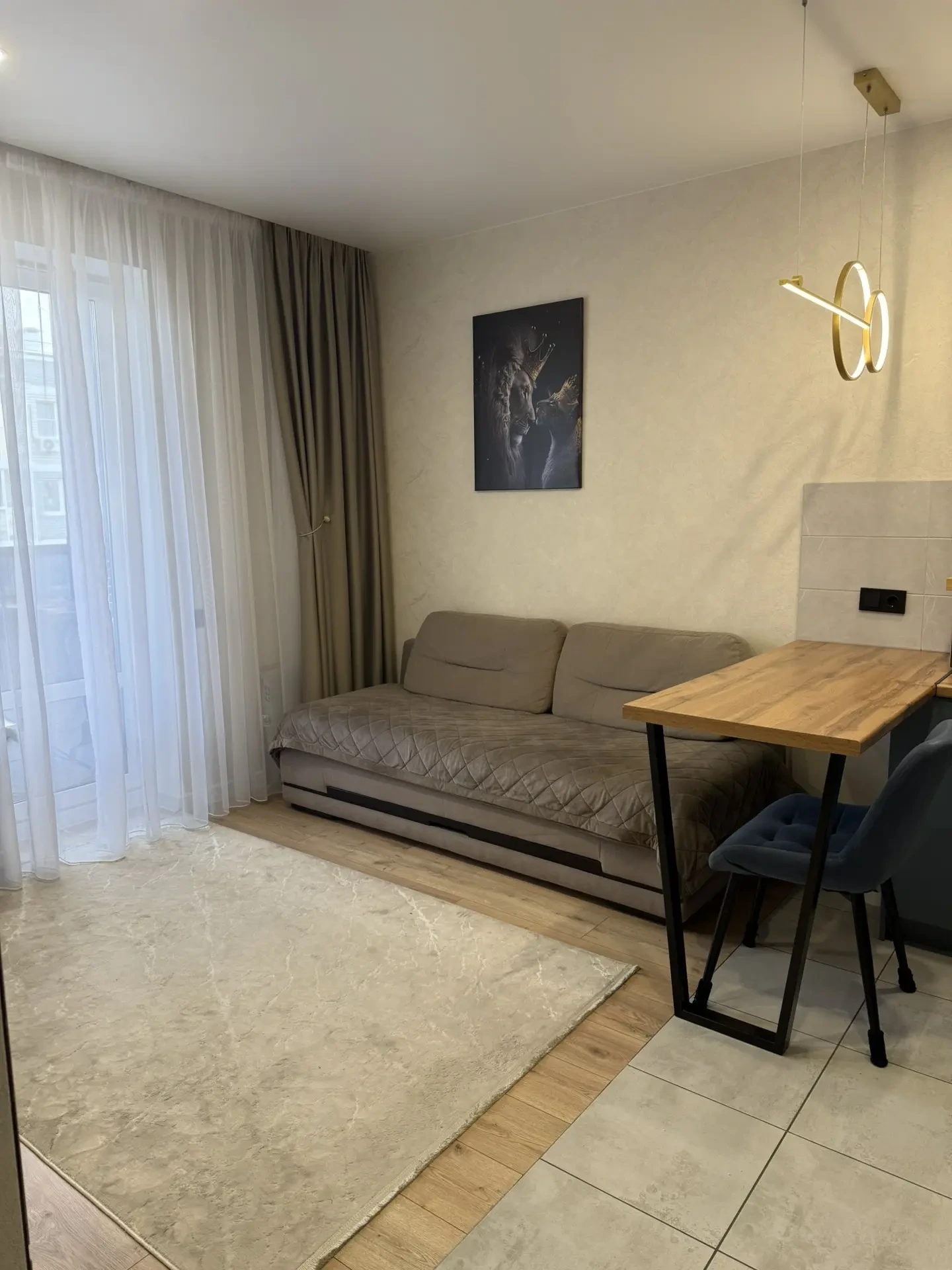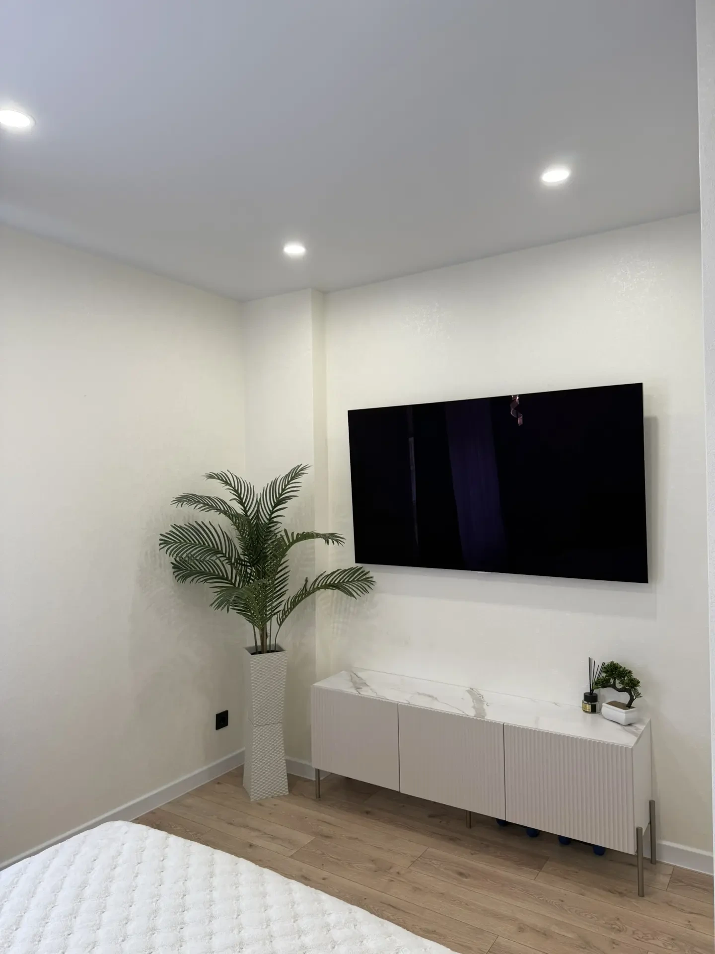Новый дизайнерский ремонт. Санузел совместный. Напольные покрытия: в прихожей, ванной и кухонной зоне — кафель, в комнате и гостиной — ламинат. На стенах — обои. Натяжные потолки везде. Точечное освещение в кухонной зоне, спальне и перед ТВ. Мебель забираем.