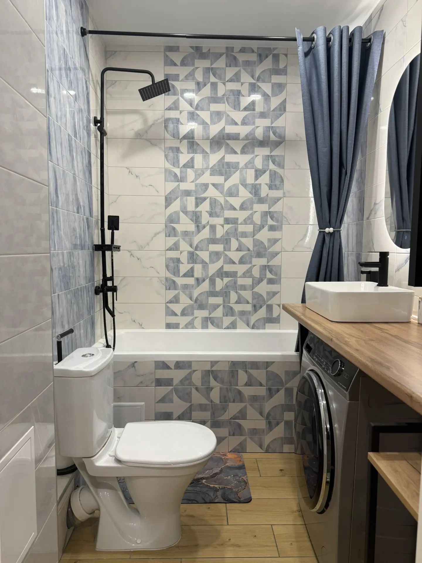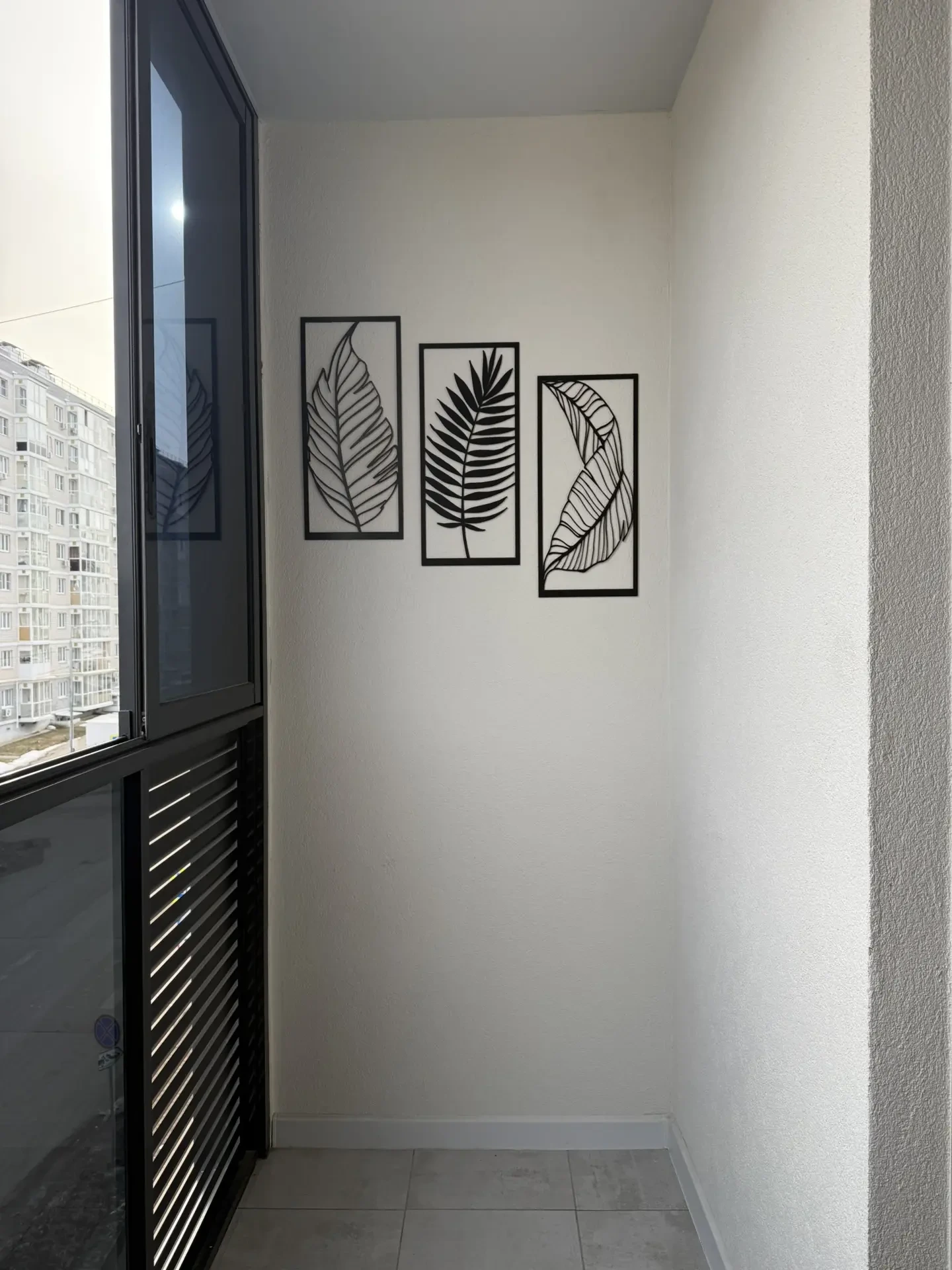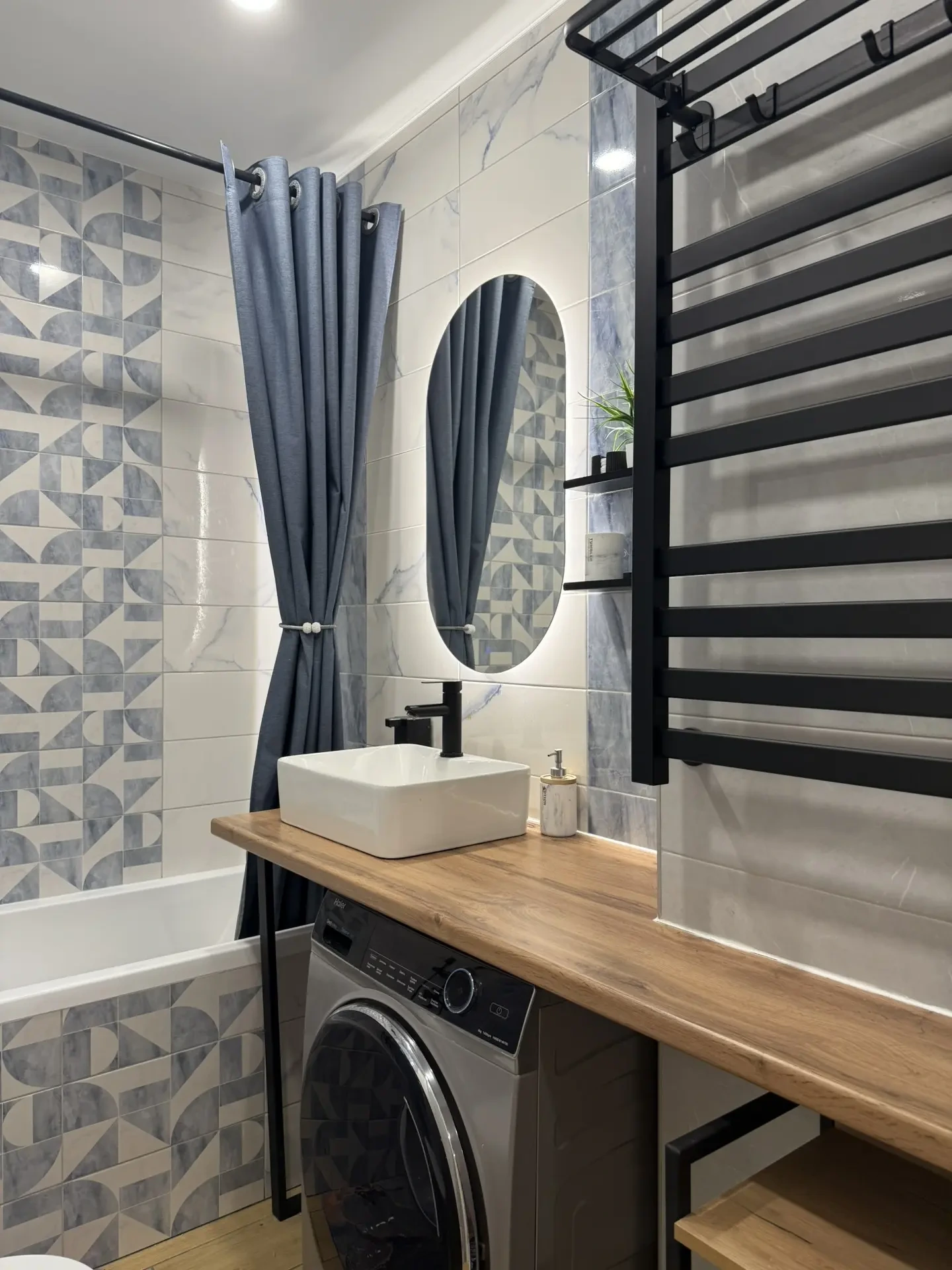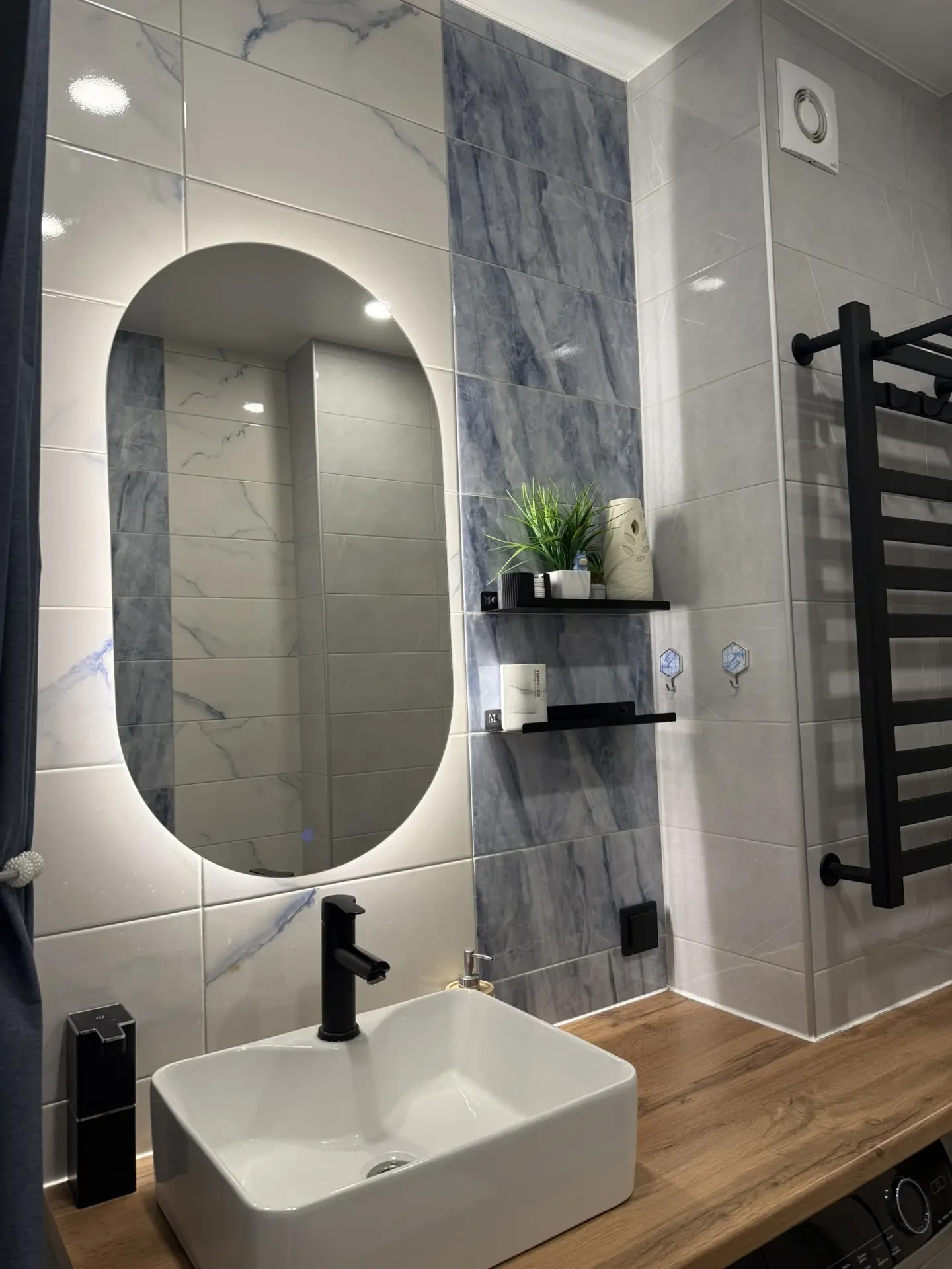 Новый дизайнерский ремонт. Санузел совместный. Напольные покрытия: в прихожей, ванной и кухонной зоне — кафель, в комнате и гостиной — ламинат. На стенах — обои. Натяжные потолки везде. Точечное освещение в кухонной зоне, спальне и перед ТВ. Мебель забираем.
