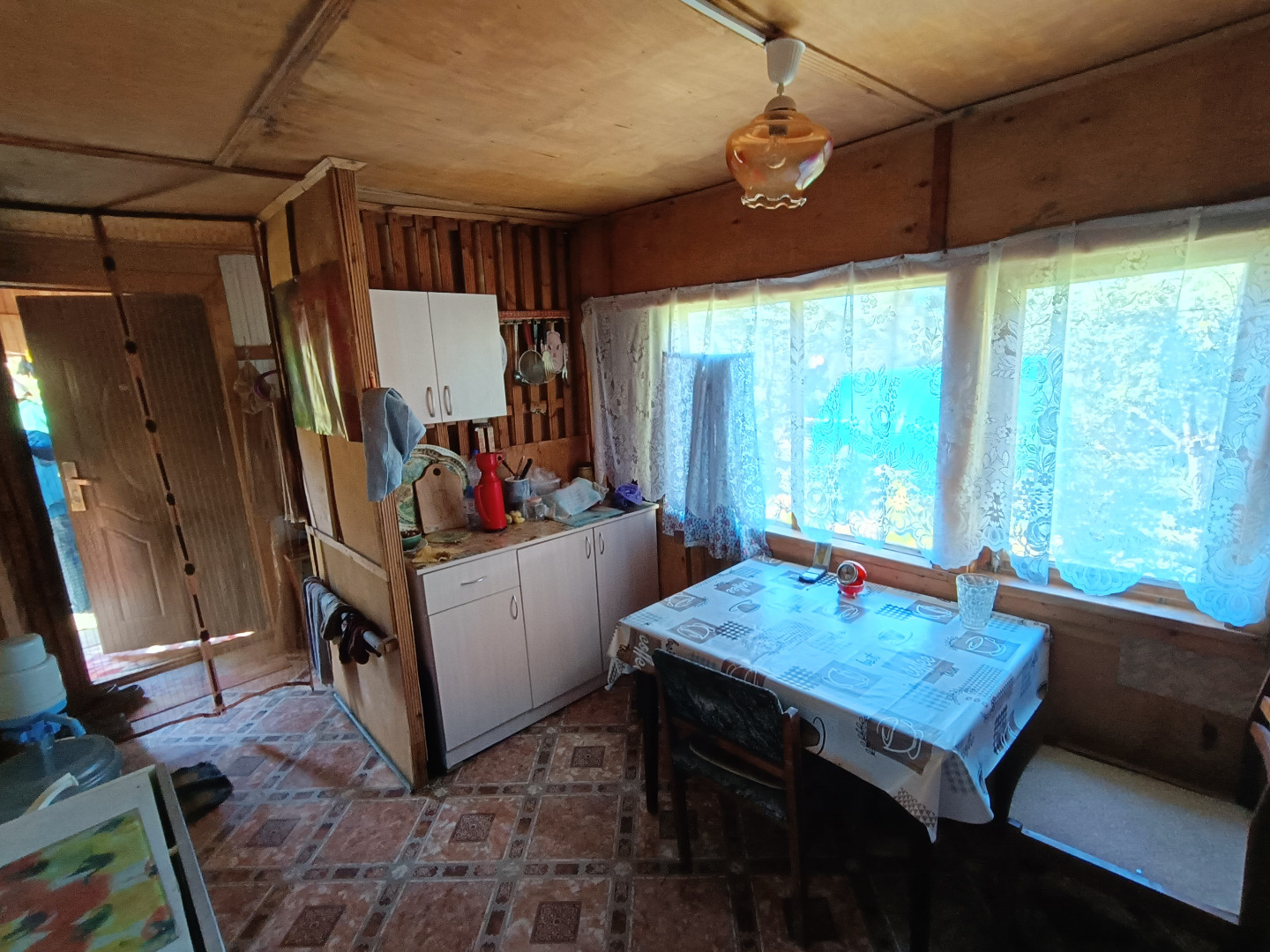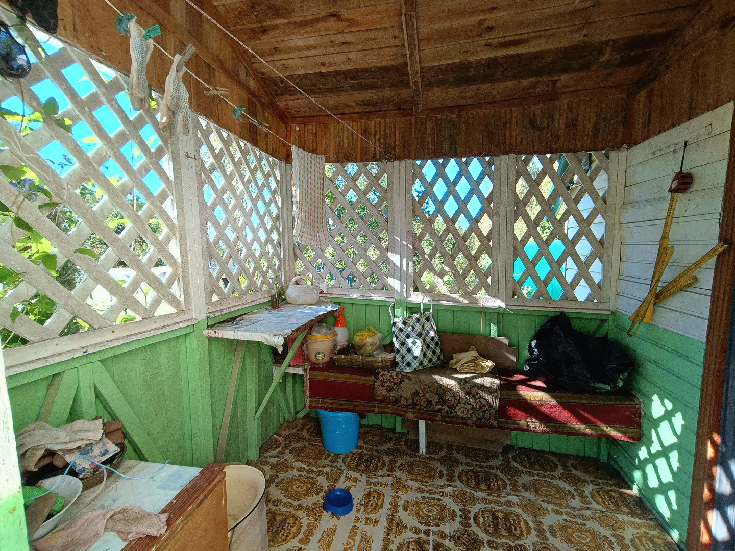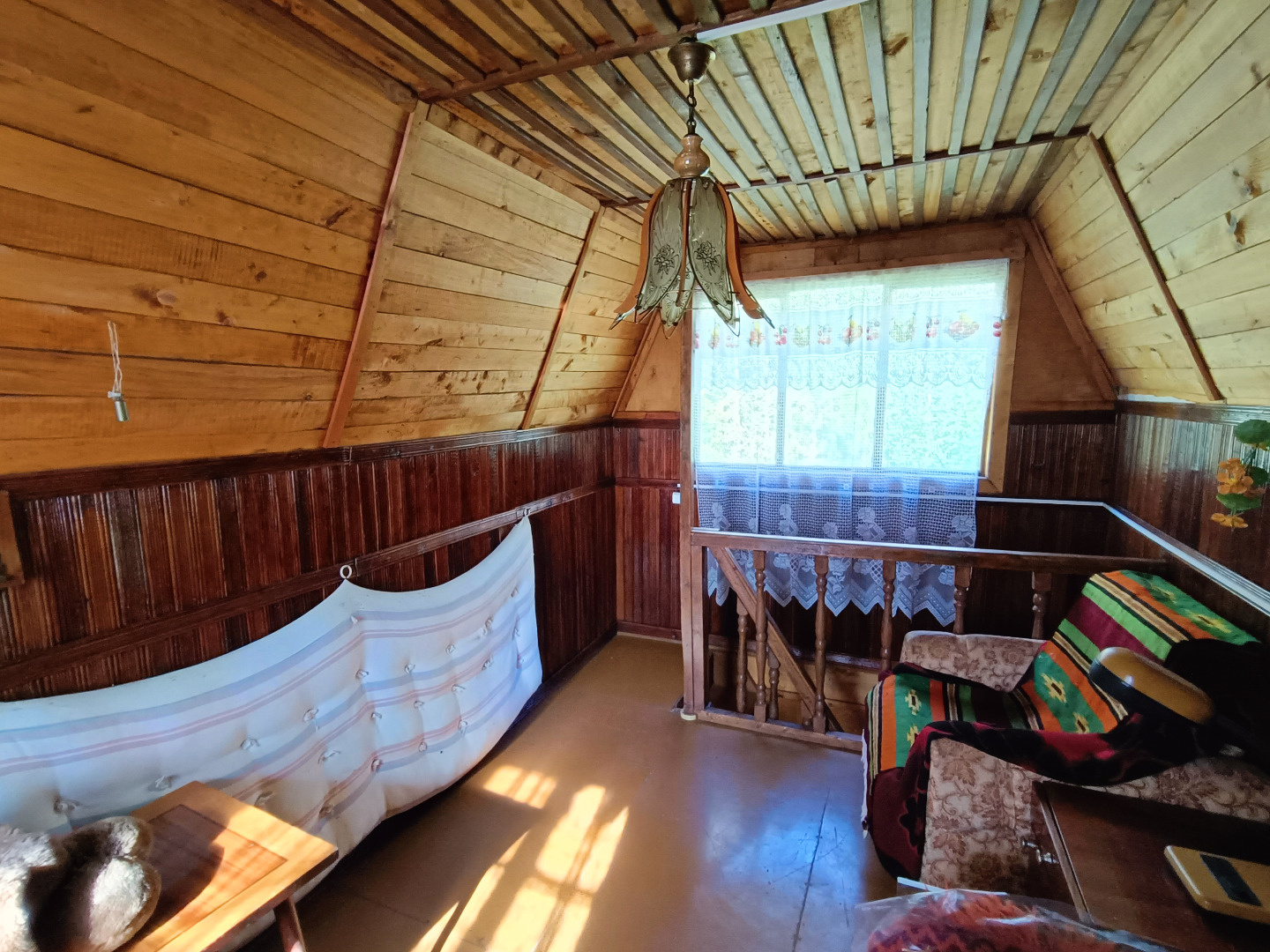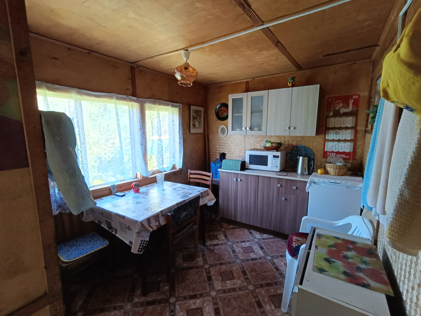 Домик стоит на высоком фундаменте, что позволяет хранить под ним инвентарь. Дом сухой, сделан из дерева. При входе есть небольшая беседка. В доме кухня, отведенное место для сан. процедур, большая комната и выход на мансарду, где расположена еще одна комната. Все, что видите на фото - остается, в том числе холодильник, микроволновка, чайник, вся мебель, телевизор (с антенной) и т.д.